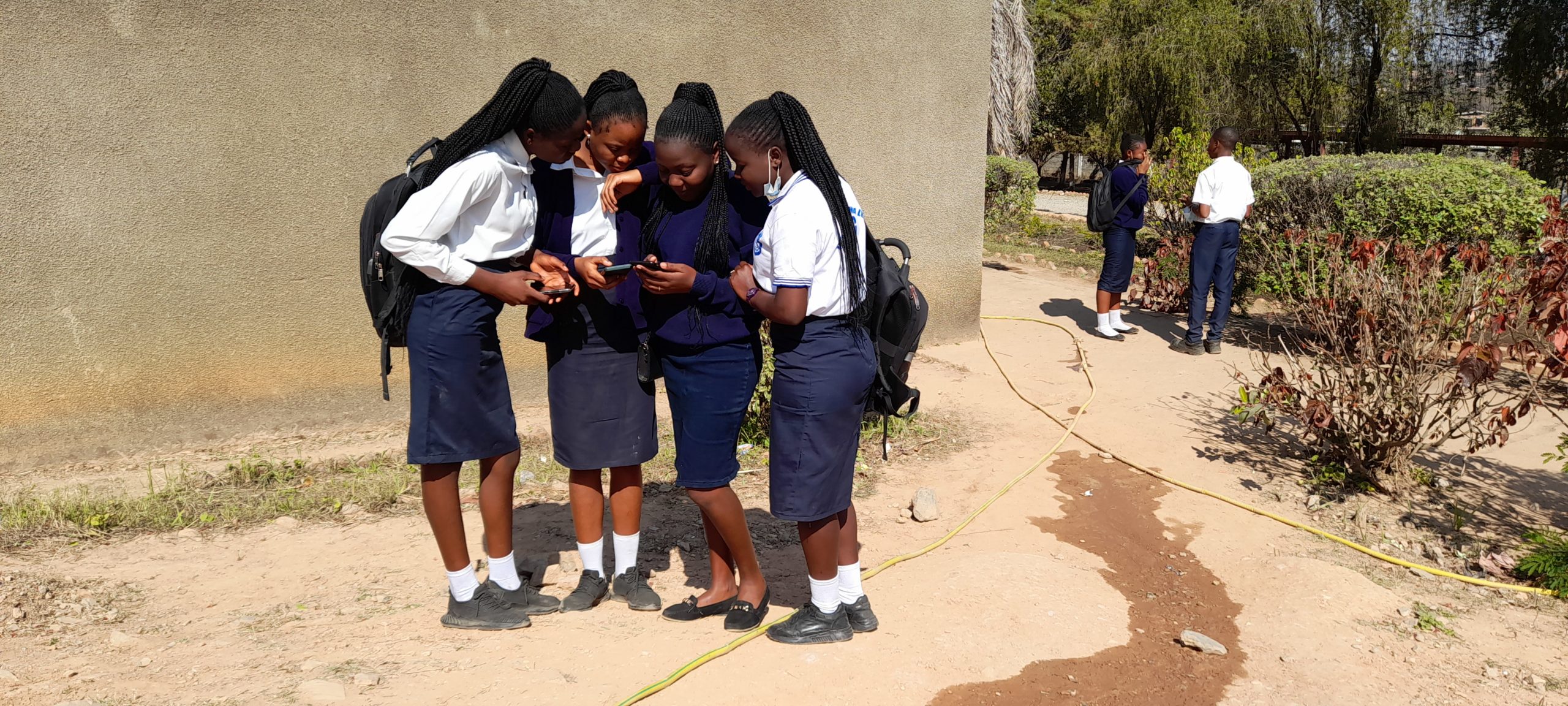 Les élèves consultent le téléphone dans la cour de l’école. Kipushi, 2021 @ponabana