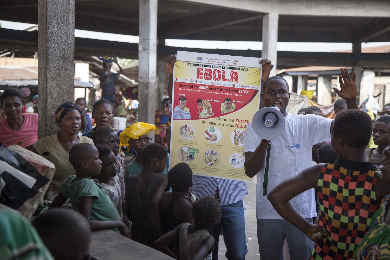 Simplice Elonga, a UNICEF-supported social mobilizer, addresses a group at Mbandaka central market, Equateur Province, the Democratic Republic of the Congo (DRC). Since the start of the Ebola outbreak in the DRC, UNICEF and its partners have reached more than 300,000 people with lifesaving information about how to avoid contracting the deadline virus.