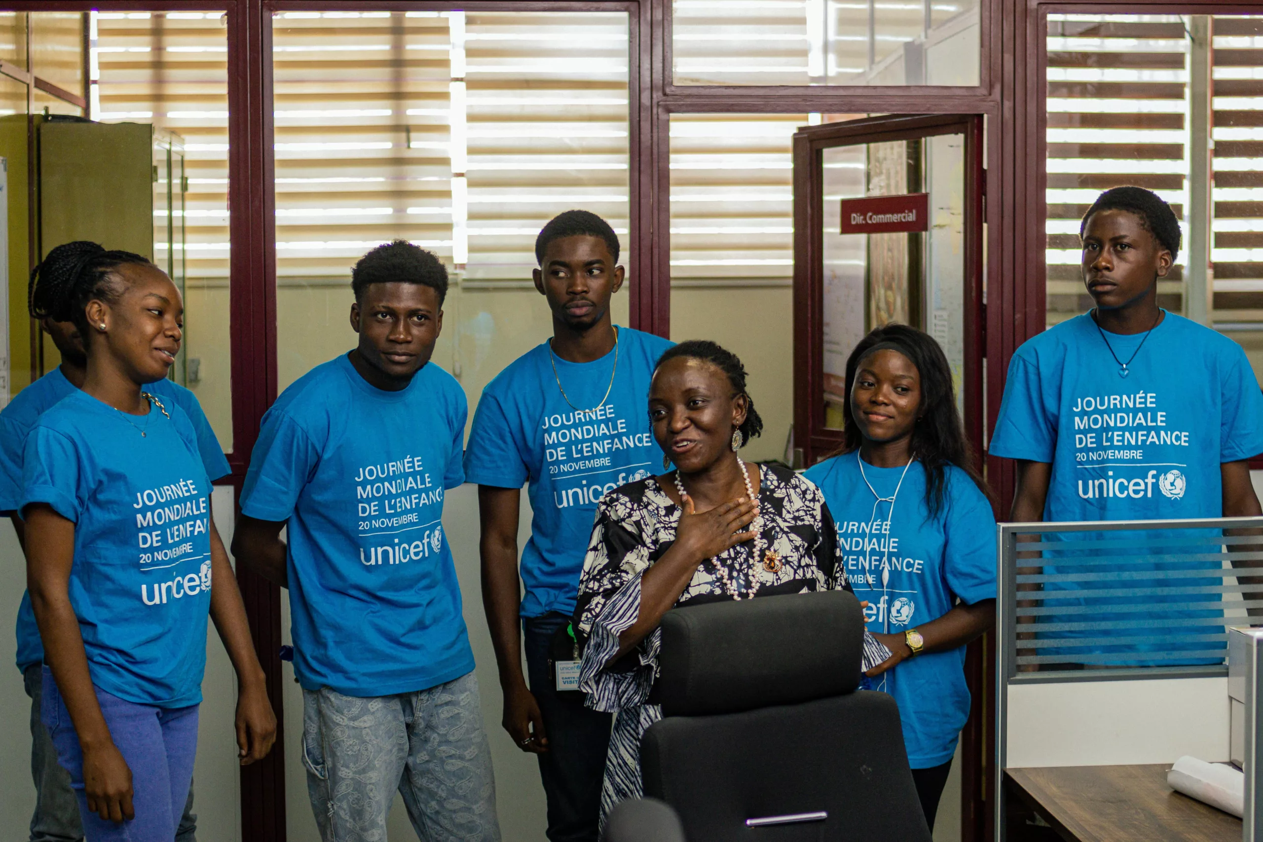 Madame Sibia Ngayihembako, directrice générale adjointe de Finca, présente ses équipes aux jeunes reporters appuyer par l’UNICEF en immersion dans Finca à Kinshasa, le 13 novembre 2024.
