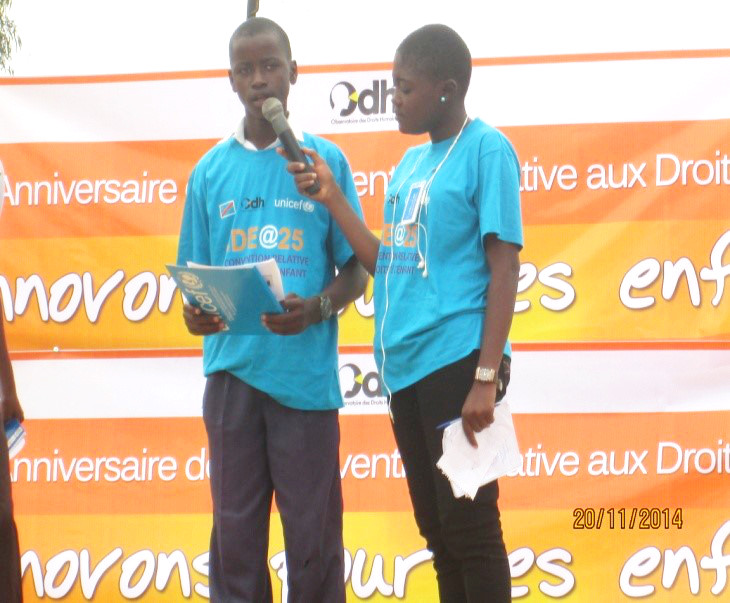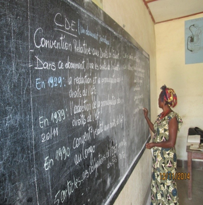 Pour rendre accessible le contenu de la CDE à un maximum d’enfants, une vaste campagne de sensibilisation a été organisée du 10 au 15 novembre 2014 dans plus de 25 écoles de la ville de Bunia et ses environs. Une synthèse de la Convention relative aux Droits de l’Enfant a été présentée aux élèves de plusieurs classes et un exemplaire de cette version synthétisée de la CDE a été remis au chef de classe pour continuer à propager le message.